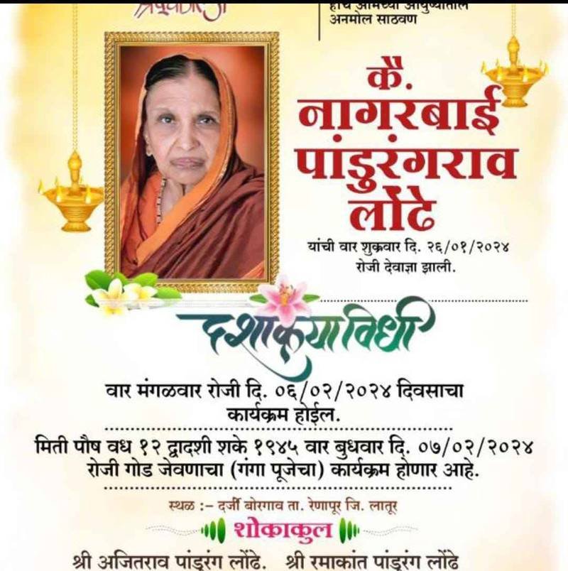 लातूर येथील खाजगी रुग्णालयात उपचारासाठी दाखल केले मात्र हृदयविकाराच्या तीव्र धक्क्याने. शुक्रवारी सकाळी त्यांची प्राणज्योत मालवली .मृत्यूसमयी त्यांचे वय 84 वर्ष होते . नागरबाई लोंढे यांच्या पश्चात चार मुले ,दोन मुली ,सुना , नातवंडे असा परिवार आहे .स्वर्गीय लोंढे यांच्या पार्थिव देहावर दिनांक.27/1/2024 रोजी शनिवारी सकाळी दहा वाजता दर्जी बोरगाव तालुका रेणापूर जिल्हा लातूर येथे अंत्यसंस्कार केले जाणार आहेत .तत्कालीन मुख्यमंत्री स्वर्गीय विलासराव देशमुख यांचे स्वीय सहाय्यक अजित लोंढे यांचे ते आई होत .नागरबाई पांडुरंगराव लोंढे यांच्या निधनाबद्दल दर्जी बोरगाव व परिसरात हळहळ व्यक्त होत आहे .