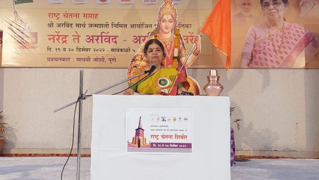 श्रीकेशवराज संचलित रेनिसन्स सीबीएसई स्कूल येथे राष्ट्र चेतना सप्ताहानिमित्त आयोजित प्रवचन मालिकेत पहिल्या दिवशी विचार मांडताना माधवी जोशी बोलत होत्या. कार्यक्रमाच्या अध्यक्षस्थानी भारतीय शिक्षण प्रसारक संस्थेच्या केंद्रीय कार्यकारिणी सदस्या श्रीमती वर्षाताई मुंडे तर प्रमुख अतिथी म्हणून सामाजिक कार्यकर्त्या सौ.नीताताई अग्रवाल स्थानिक समन्वय समितीचे अध्यक्ष धनंजय कुलकर्णी तुंगीकर तसेच रेनिसन्स सीबीएसई स्कूलचे अध्यक्ष डॉ.मनोज शिरुरे यांची मंचावर उपस्थिती होती. ‘नरेंद्र ते अरविंद-अरविंद ते नरेंद्र’ हा श्रीमती जोशी यांच्या प्रवचनाचा विषय होता.