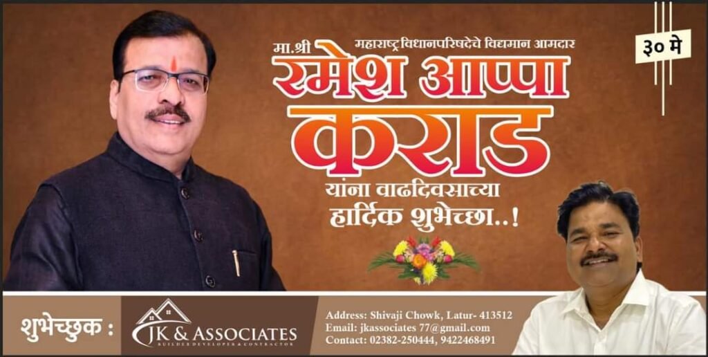 उपेक्षितांचा नेता, गोरगरीबांचा कैवारी जिल्ह्यातील सत्ताधिश व लब्ध प्रतिष्ठीतांच्या विरुद्ध मागील २५ वर्षापासून शड्डू ठोकून ताठ मानेने वावरणारा एकमेव नेता म्हणजे आ. रमेशअप्पा कराड. कुठलीही राजकीय पार्श्वभूमी नसताना स्व. गोपीनाथराव मुंडे यांच्या नेतृत्वाच्या मुशीतून तयार झालेला एक सामान्य कार्यकर्ता, कधीही निष्ठा न विकणारा कार्यकर्ता म्हणजे रमेशअप्पा कराड. आज बरेच पुढारी त्यांना राजकीय जन्म देणार्या नेत्यांना विसरुन गेले व वेगवेगळ्या चुलीवर आपली राजकीय पोळी शेकून घेत असल्याचे दिसते, काहीतर आपल्या नेत्यांच्याच पाठीत खंजीर खुपसून राजकीय नेतृत्व बदलत आपले राजकीय संसार थाटून राजकीय दुकान चालवताना दिसतात. परंतु आजही आ. रमेशअप्पा कराड हे त्यांचे राजकीय गुरु स्व. गोपीनाथराव मुंडे यांचे स्मरण केल्याशिवाय कुठल्याही सार्वजनिक कार्यक्रमास सामोरे जात नाहीत. अशा नेत्याचा मा. आ. रमेशअप्पा कराड तथा जिल्हाध्यक्ष भारतीय जनता पार्टी लातूर यांचा आज वाढदिवस.