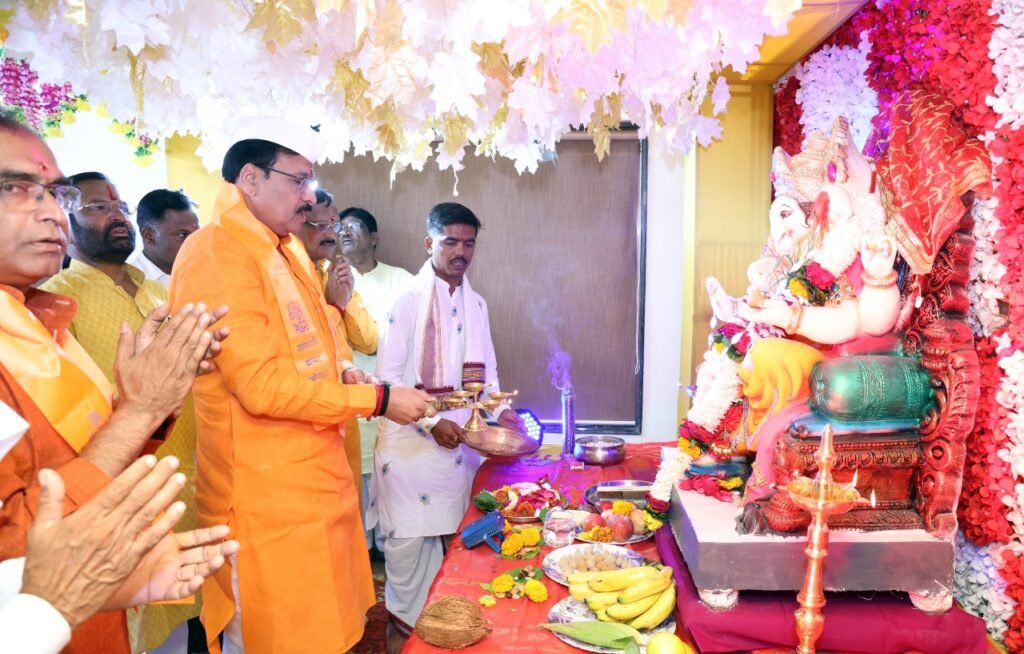 लातूर येथील अंबाजोगाई रोडवर असलेल्या भाजपाच्या संवाद कार्यालयात बुधवारी दुपारी साडेबारा वाजता भाजपाचे जिल्हाध्यक्ष आ. रमेशआप्पा कराड यांच्या शुभहस्ते विधिवत श्रीगणेशाची स्थापना करण्यात आली. मंगलमय वातावरणात पूजा, आरती करून मोदकाचा नैवेद्य दाखवण्यात आला.