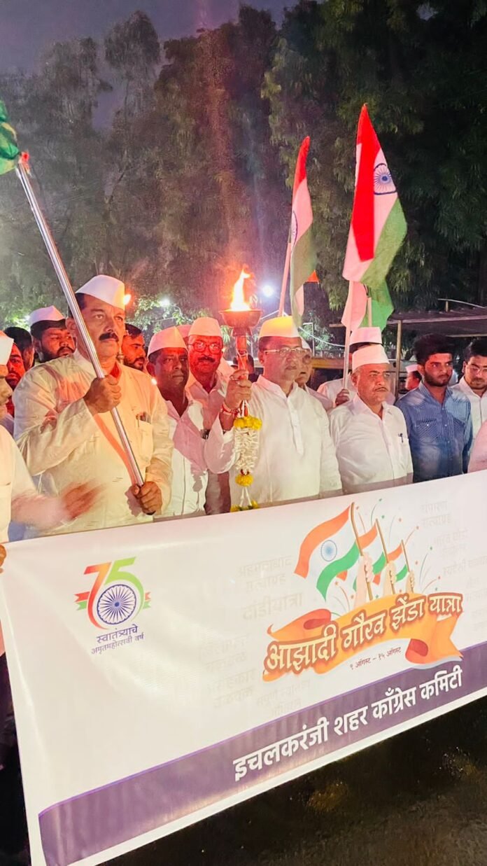 भारतीय स्वातंत्र्याच्या 75 व्या अमृत महोत्सवी वर्धापनदिनानिमित्त इचलकरंजी शहर काँग्रेस कमिटीच्या वतीने भव्य आजादी गौरव यात्रा काढण्यात आली. यावेळी विविध स्वातंत्र्यसैनिकांच्या वेशभूषेमध्ये विद्यार्थी सहभागी झाले होते. सदर फेरी इचलकरंजी शहर काँग्रेस कमिटीपासून सुरू होऊन छत्रपती शिवाजी पुतळा ते गांधी पुतळा व काँग्रेस कमिटीपर्यंत काढण्यात आली. तदनंतर मध्यरात्री बारा वाजून पाच मिनिटांनी अमृत महोत्सवी स्वातंत्र्य दिनाचे ध्वजारोहण स्वातंत्र्य सैनिक निजामुद्दीन काझी यांच्या वीर पत्नी श्रीमती अशरफबी निजामुद्दीन काझी यांच्या हस्ते करण्यात आले.