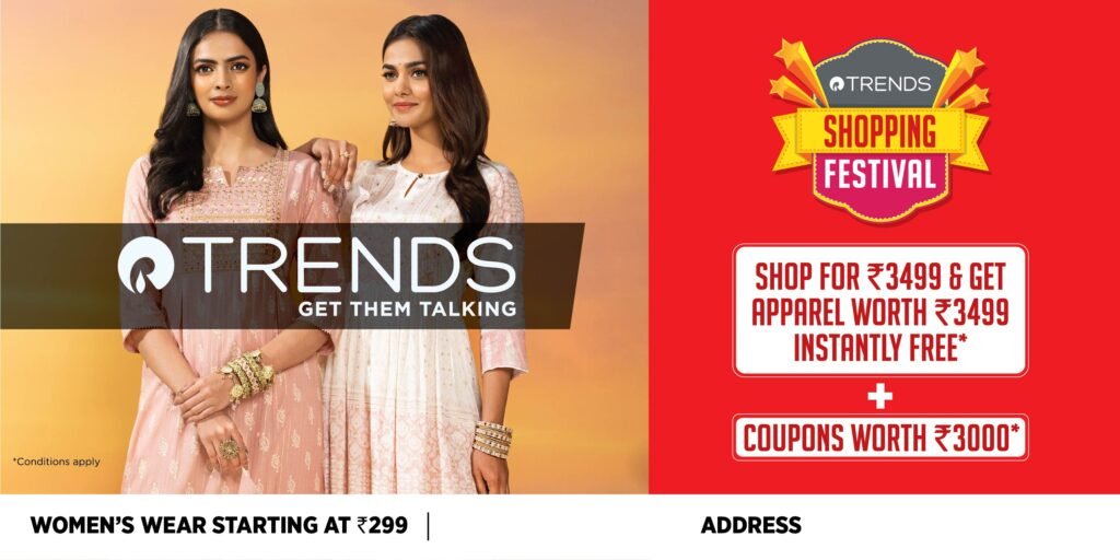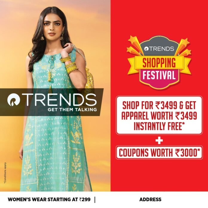 ट्रेंड्स आपल्या नावाला जागून ग्राहकांपर्यंत सर्वोत्कृष्ट फॅशन आणि ब्रँड्स आणण्यासाठी सज्ज आहे, त्याच्या नावाप्रमाणेच ट्रेंड्स शॉपिंग फेस्टिव्हल ही फॅशनची आजपर्यंतची सर्वात मोठी विक्री आहे ज्यामध्ये एक विशेष ऑफर आहे तुम्ही रु. 3499 ची खरेदी करा – आणि पुरूषांचे पोशाख, लहान मुलांचे पोशाख आणि महिलांच्या पोशाखांच्या विस्तृत श्रेणीवर रु. 3499 किमतीचा मर्चेंडाइज मोफत मिळवा.