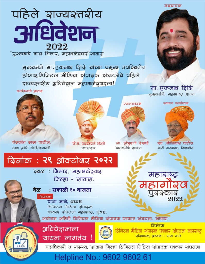 डिजिटल मीडिया संपादक पत्रकार संघटनेचे पहिले राज्यस्तरीय अधिवेशन पुस्तकांचं गाव भिलार महाबळेश्वर येथे शनिवार दि २९ऑक्टोबर २०२२रोजी होणार असून या अधिवेशनाचे उद्घाटन मुख्यमंत्री एकनाथ शिंदे यांचे हस्ते होणार असून या अधिवेशनाच्या अध्यक्षपदी उच्च व तंत्र शिक्षण मंत्री चंद्रकांत (दादा) पाटील तर स्वागताध्यक्षपदी सातारा जिल्ह्याचे पालकमंत्री व राज्याचे उत्पादन शुल्क मंत्री शंभूराज देसाई, स्वागत कार्याध्यक्षपदी सिक्कीमचे माजी राज्यपाल खासदार श्रीनिवास पाटील व प्रमुख पाहुणे म्हणून श्रीमंत छत्रपती खासदार उदयनराजे भोसले हे उपस्थित राहणार असल्याची माहिती डिजिटल मीडिया संपादक पत्रकार संघटनेचे संस्थापक ,अध्यक्ष राजा माने यांनी पत्रकार परिषदेत दिली.यावेळी संघटनेच्यावतीने राज्यातील विविध क्षेत्रातील मान्यवरांना दिल्या जाणाऱ्या “महाराष्ट्र महागौरव पुरस्कारांची घोषणा करण्यात आली.