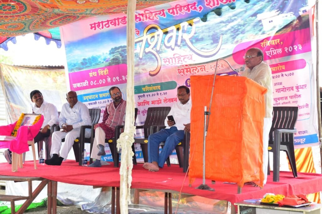 तिसऱ्या शिवार साहित्य संमेलन निटूर ता.निलंगा येथे आज संपन्न झाले. ३० एप्रिल २०२३ या एकदिवसीय साहित्य संमेलनात अध्यक्ष पदावरून डॉ. नागोराव कुंभार बोलत होते. साहित्य हे समाजाच्या भरणपोषणासाठी मूलभूत विचारपीठ आहे. साहित्याने व्यक्ती समाज व राष्ट्र उभे राहते. माणसांच्या शारीरिक गरजा भौतिक सुखाने पूर्ण होतात तर मनाच्या आणि चिंतनाच्या गरजा साहित्य पूर्ण करते. विज्ञान तंत्रज्ञानामुळे आपला विकास होतो. परंतु सामाजिक दृष्ट्या एकतेचा, समतेचा विकास होण्यासाठी साहित्यातून शाश्वत मूल्यांची पेरणी करणे आवश्यक असते. माणूस ही एक मोठी विकास करणारी पायाभूत संस्था असून तीच संस्था समाजाबरोबर राष्ट्राचा उद्धार करते. म्हणून महात्मा ज्योतिराव फुले, डॉ. बाबासाहेब आंबेडकर, कार्ल मार्क्स या व्यक्तींनी समाजाच्या उद्धाराकरता आपले साहित्य लेखणी स्पष्टपणे आणि वैचारिक भूमिका घेऊन सतत तळपत ठेवलेली आहे. त्याप्रमाणेच मराठी साहित्यिकांनी सुद्धा आपली भूमिका नाही रे वर्गाच्या बाजूने उभी करून समाजात न्याय,नीती, समता, बंधुता,व स्वातंत्र्य या शाश्वत मूल्याची पेरणी करावी. साहित्य हे चिंतनाचे मूळ आहे. साहित्यातून समाज अनुभवनिष्ठपणे प्रगट झाला पाहिजे. साहित्य हे समाजाला व राष्ट्राला आधार देण्याचे काम करते. साहित्य हे देश व समाजाचे विघटन होताना ते जोडण्याची काम करते. साहित्य हे एक मार्गदर्शक तत्व आहे. ते आपल्या जगण्याला वैचारिक आधार देते. म. ज्योतिराव फुले यांनी ग्रंथकार सभेला पत्र लेखन करून जी भूमिका घेतली होती ती भूमिका आजच्या साहित्यिकांनी घेतली पाहिजे. समाजाच्या व्यथा वेदना आणि दुःखाचा शोध घ्या आणि आपल्या साहित्याला मूल्यांचा आत्मा द्या,असे डॉ. नागोराव कुंभार अध्यक्षपदावरून बोलत होते.