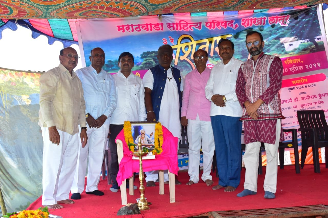 तिसऱ्या शिवार साहित्य संमेलन निटूर ता.निलंगा येथे आज संपन्न झाले. ३० एप्रिल २०२३ या एकदिवसीय साहित्य संमेलनात अध्यक्ष पदावरून डॉ. नागोराव कुंभार बोलत होते. साहित्य हे समाजाच्या भरणपोषणासाठी मूलभूत विचारपीठ आहे. साहित्याने व्यक्ती समाज व राष्ट्र उभे राहते. माणसांच्या शारीरिक गरजा भौतिक सुखाने पूर्ण होतात तर मनाच्या आणि चिंतनाच्या गरजा साहित्य पूर्ण करते. विज्ञान तंत्रज्ञानामुळे आपला विकास होतो. परंतु सामाजिक दृष्ट्या एकतेचा, समतेचा विकास होण्यासाठी साहित्यातून शाश्वत मूल्यांची पेरणी करणे आवश्यक असते. माणूस ही एक मोठी विकास करणारी पायाभूत संस्था असून तीच संस्था समाजाबरोबर राष्ट्राचा उद्धार करते. म्हणून महात्मा ज्योतिराव फुले, डॉ. बाबासाहेब आंबेडकर, कार्ल मार्क्स या व्यक्तींनी समाजाच्या उद्धाराकरता आपले साहित्य लेखणी स्पष्टपणे आणि वैचारिक भूमिका घेऊन सतत तळपत ठेवलेली आहे. त्याप्रमाणेच मराठी साहित्यिकांनी सुद्धा आपली भूमिका नाही रे वर्गाच्या बाजूने उभी करून समाजात न्याय,नीती, समता, बंधुता,व स्वातंत्र्य या शाश्वत मूल्याची पेरणी करावी. साहित्य हे चिंतनाचे मूळ आहे. साहित्यातून समाज अनुभवनिष्ठपणे प्रगट झाला पाहिजे. साहित्य हे समाजाला व राष्ट्राला आधार देण्याचे काम करते. साहित्य हे देश व समाजाचे विघटन होताना ते जोडण्याची काम करते. साहित्य हे एक मार्गदर्शक तत्व आहे. ते आपल्या जगण्याला वैचारिक आधार देते. म. ज्योतिराव फुले यांनी ग्रंथकार सभेला पत्र लेखन करून जी भूमिका घेतली होती ती भूमिका आजच्या साहित्यिकांनी घेतली पाहिजे. समाजाच्या व्यथा वेदना आणि दुःखाचा शोध घ्या आणि आपल्या साहित्याला मूल्यांचा आत्मा द्या,असे डॉ. नागोराव कुंभार अध्यक्षपदावरून बोलत होते.