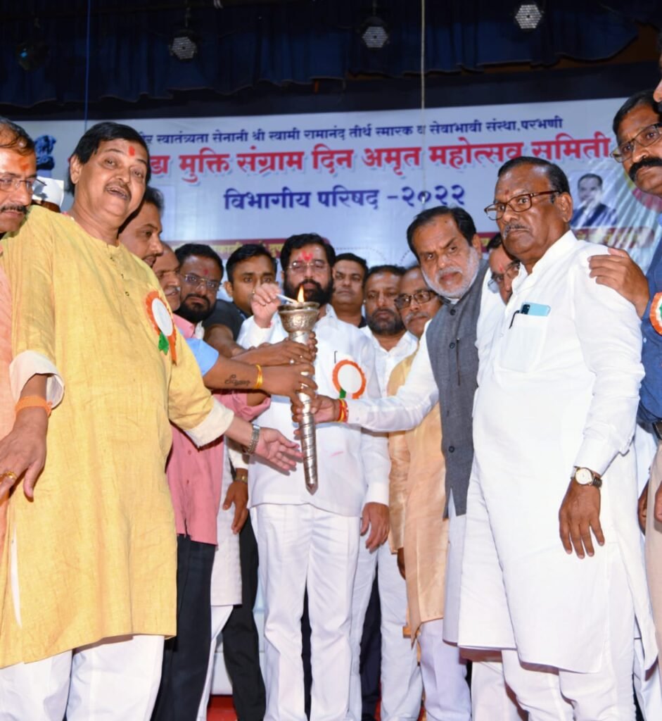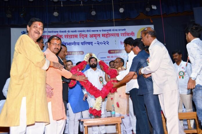 मराठवाडा मुक्तिसंग्राम दिनानिमित्त थोर स्वातंत्र्यता सेनानी श्री स्वामी रामानंद तीर्थ स्मारक व सेवाभावी संस्था परभणी, मराठवाडा मुक्ती संग्राम दिन अमृत महोत्सव समितीकडून शहरातील तापडिया नाट्य मंदिरात आयोजित करण्यात आलेल्या विभागीय परिषदेत मुख्यमंत्री शिंदे बोलत होते. यावेळी सर्वश्री आमदार अभिमन्यू पवार, संजय शिरसाट, प्रदीप जैस्वाल यांच्यासह निशिकांत भालेराव, सुभाष जावळे, रामेश्वर शिंदे, अरूण मराठे आदींची प्रमुख उपस्थिती होती.