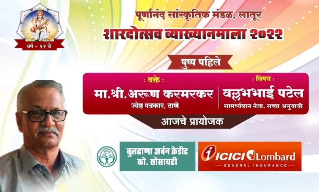 लातूर येथील पूर्णानंद सांस्कृतिक मंडळाच्या वतीने आयोजित करण्यात आलेल्या शारदोत्सव व्याख्यानमालेचे प्रथम पुष्प करमरकर यांनी ‘ वल्लभभाई पटेल : सामर्थ्यवान नेता, सच्चा अनुयायी या विषयावर गुंफले. त्यावेळी ते बोलत होते. कार्यक्रमाच्या अध्यक्षस्थानी व्याख्यानमालेचे यावर्षीचे अध्यक्ष गोविंदराव कुलकर्णी हे होते. व्यासपीठावर प्रायोजक प्रतिनिधी बुलढाणा अर्बनचे मारोती घोणसे, आयसीआयसीआय बँकेचे गजानन काटीकर , व्याख्यानमालेचे सचिव प्रकाश घादगिने आदी मान्यवरांची प्रमुख उपस्थिती होती.