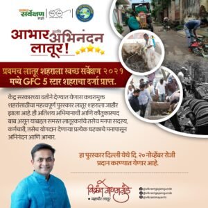 लातूर/प्रतिनिधी:स्वच्छ सर्वेक्षण २०२१ मध्ये लातूर महानगरपालिकेस जीएफसी शहराचा दर्जा प्राप्त झाला असून फाईव्ह स्टार मानांकन मिळाले आहे.असे मानांकन मिळवणारी लातूर ही मराठवाड्यातील एकमेव महानगरपालिका आहे. दि.२० नोव्हेंबर रोजी दिल्ली येथे राष्ट्रपती,पंतप्रधान व केंद्रीय मंत्र्यांच्या उपस्थितीत पुरस्काराचे वितरण होणार असून मनपाच्या वतीने महापौर आणि पालिका आयुक्त पुरस्काराचा स्वीकार करणार आहेत.