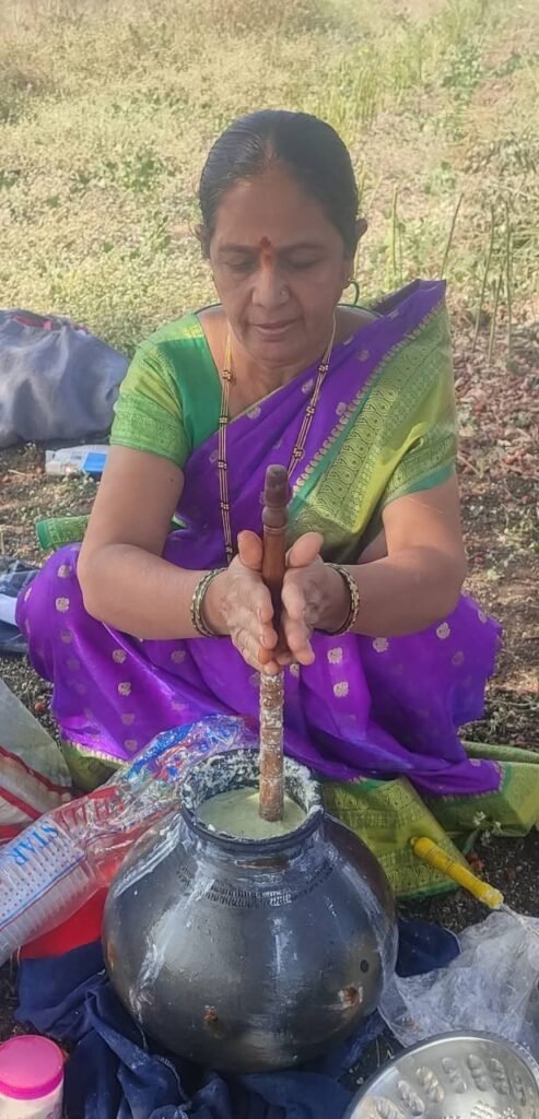 आंबिल म्हणजे ब्रम्हानंदी टाळीच – जेवणातील दुसरा महत्वाचा पदार्थ म्हणजे आंबिल. यांच्यासमोर सर्व पेय फिके पडणार असे याचे वैशिष्ट्य. आंबिल तयार करण्यासाठी चार – पाच दिवस अगोदरच दही लाऊन ठेवलेले असते. एक – दोन दिवस अगोदर त्याचे ताक करून ठेवले जाते. अद्रक, लसण, जीरे यांची दिलेली फोडणी. ज्वारीच्या पिठात बनवलेली ही आंबिल पिऊन झाडाच्या सावलीत घेतलेली एक डुलकी म्हणजे ब्रम्हानंदी टाळीच. यांची चव एवढी भारी असते की कितीही पिले तर समाधानी होत नाही. अधिक आंबील पिल्याने दुसर्या दिवशी अनेकांचे तोंडही सुजवते. आंबील तयार करून ती मातीच्या माठामध्ये भरून पायात चप्पल न घालवता ती डोक्यावर ठेवून शेतात घेऊन जाण्यात येत असते. माठात ठेवलेली असल्याने ती नैसर्गिक थंड झालेली असते. ही थंड आंबील ग्लासावर ग्लास रिचवली जाते.