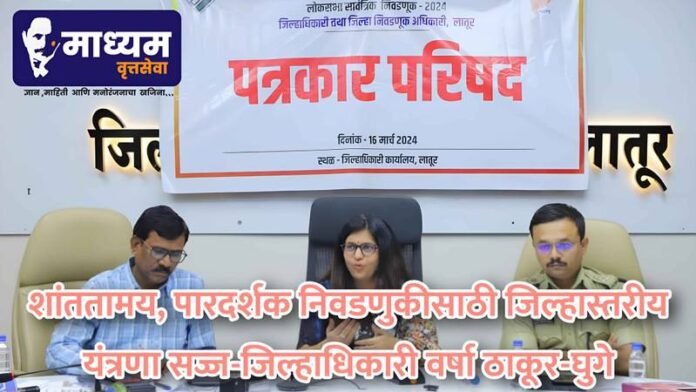 लातूर, दि. 16( वृत्तसेवा )- : भारत निवडणूक आयोगाने घोषित केलेल्या निवडणूक कार्यक्रमानुसार लातूर लोकसभा मतदारसंघामध्ये 7 मे 2024 रोजी मतदान होणार आहे. निवडणूक कार्यक्रम घोषित झाल्यापासूनच जिल्ह्यात आदर्श आचारसंहिता लागू झाली आहे. आदर्श आचारसंहितेची अंमलबजावणी करून निवडणूक शांततामय आणि पारदर्शक वातावरणात पार पाडण्यासाठी जिल्हास्तरीय निवडणूक यंत्रणा सज्ज असल्याचे जिल्हाधिकारी तथा जिल्हा निवडणूक अधिकारी वर्षा ठाकूर-घुगे यांनी आज पत्रकार परिषदेत सांगितले. तसेच यावेळी मतदानाची टक्केवारी वाढविण्यासाठी विविध उपक्रम हाती घेण्यात आल्याचे त्या म्हणाल्या.