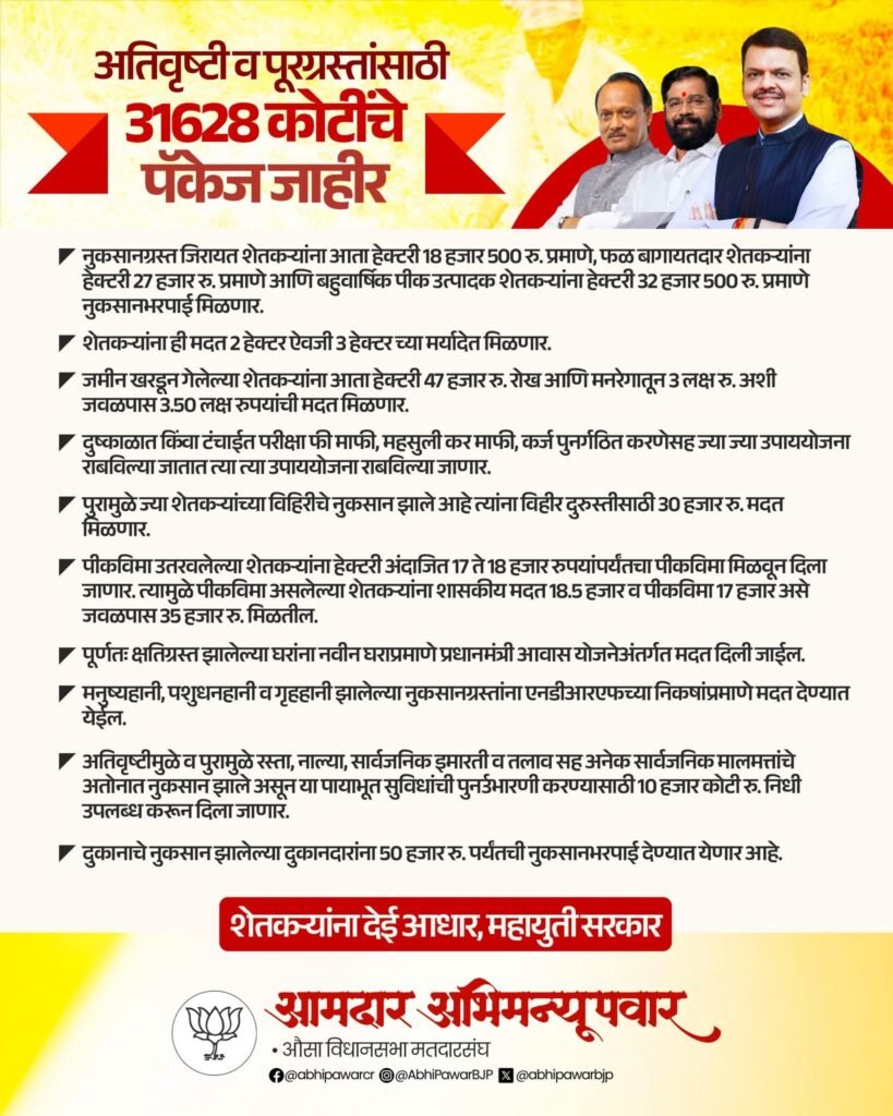 नुकसानग्रस्त भागातील बळीराजाला पुन्हा उभे करण्यासाठी 31 हजार 628 कोटींच्या मदतीचे पॅकेज मुख्यमंत्री देवेंद्र फडणवीस यांनी आज जाहीर केले. या पॅकेजनुसार कोरडवाहू शेतीसाठी प्रति हेक्टरी 18 हजार 500 रुपये, हंगामी बागायतीसाठी 27 हजार रुपये तर बागायतीसाठी प्रति हेक्टरी 32 हजार 500 रुपये मदत दिली जाणार आहे. जाहीर करण्यात आलेली मदत दिवाळीपूर्वी देण्याचा प्रयत्न राहणार असून ही आतापर्यंतची सर्वात मोठी आर्थिक मदत असल्याचेही मुख्यमंत्री देवेंद्र फडणवीस यांनी यावेळी सांगितले.