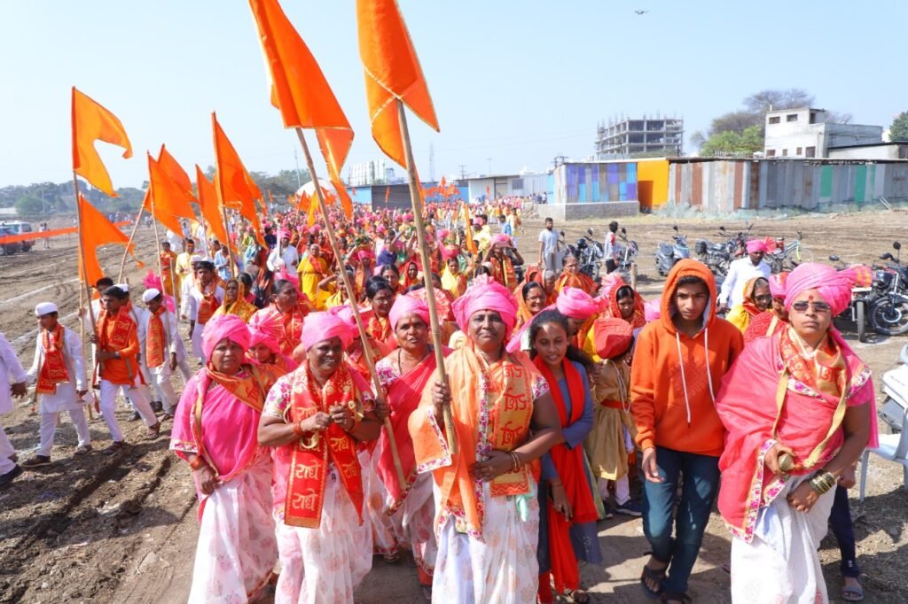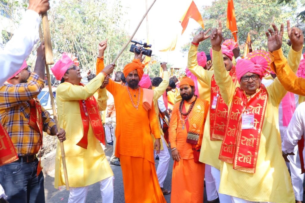 लातूर ; दि. २५ (प्रतिनिधी )– टाळ मृदंगाचा नाद , झिम्मा फुगडी , भगवंताचे नामस्मरण आणि राधे राधेचा जयघोष करीत निघालेल्या शोभायात्रेने लातूरकरांचे लक्ष वेधले. अतिशय शिस्तबद्ध रीतीने काढण्यात आलेल्या या शोभायात्रेचे भाविक भक्तांनी गुलाबपुष्पाची उधळण करून स्वागत केले.