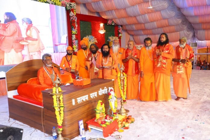 जवळपास तीन तास मार्गक्रमण करून ही शोभायात्रा कथा मंडपात आली. यावेळी बाबांनी सर्वप्रथम गोमातेचे पूजन केले .यावेळी 21 ब्रह्मवृंदांनी मंत्र पठण केले. यानंतर बाबांच्या हस्ते ध्वजारोहण करण्यात आले. मंत्रोच्चार व बाबांच्या जयघोषात सगळेजण कथा मंडपात आले. व्यासपीठावर आल्यानंतर मंत्रपठण ,  आरती करण्यात आली .18 यजमानांनी यावेळी आरतीत  सहभाग नोंदवला. यावेळी विविध प्रांतातून आलेल्या साधू संतांचा संयोजन समितीच्या वतीने यथोचित सत्कार करून त्यांना वंदन करण्यात आले .यामध्ये  प.पू. 1008 महामंडलेश्वर अभयानंद गिरीजी महाराज (परभणी ) ,प.पू .ह भ प राजेंद्र गिरीजी महंत ( देवताळा)  प. पू. नित्यानंद गिरीजी महाराज ( शिर्डी) , प.पू. महंत गोपाळ पुरीजी (उस्मानाबाद ) ,प. पू. महंत स्वामी पूर्णानंद सरस्वतीजी , प. पू. महंत सुनील भारतीजी  (हनुमान गड , राजस्थान )  , प.पू. महंत  गोविंदानंद गिरीजी  (हरिद्वार ) , प. पू. महंत बालकानंद गिरीजी महाराज  (आंध्र प्रदेश ) आदींचा समावेश होता.