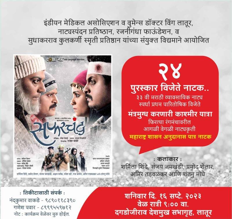लातूरच्या दगडोजीराव देशमुख नाट्यगृहाच्या रंगमंचावर हे सगळं पहायला मिळणार आहे दि. १६ सप्टेंबर, २०२३ रोजी – इंडियन मेडिकल असोसिएशन, नाट्यस्पंदन प्रतिष्ठान, रजनीगंधा फाउंडेशन आणि सुधाकरराव कुलकर्णी स्मृती प्रतिष्ठान यांच्या संयुक्त विद्यमाने.