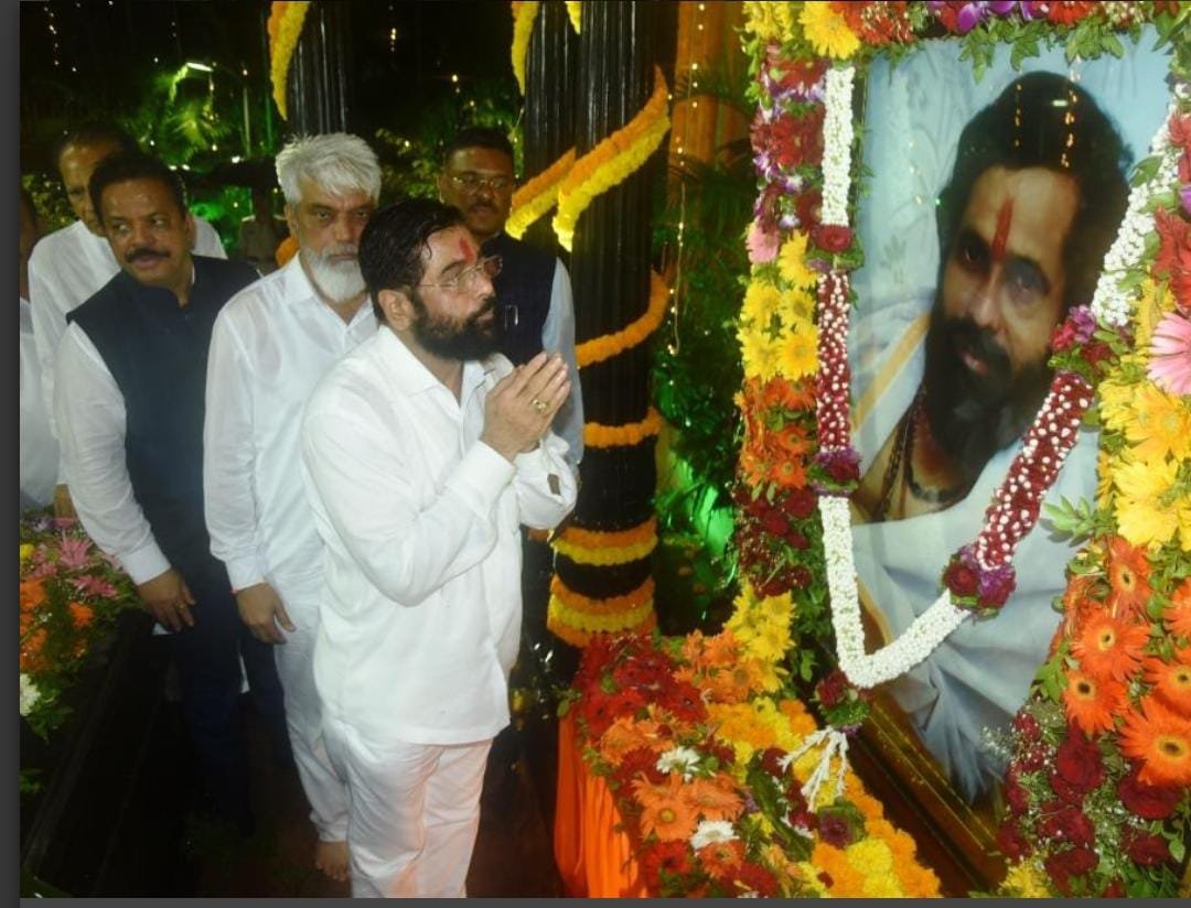 मुख्यमंत्री श्री. शिंदे यांचे आमदारांसमवेत रात्री सव्वा नऊच्या सुमारास आनंद नगर चेक नाक्यावर आगमन झाले. यावेळी त्यांच्या वाहनावर पुष्पवृष्टी करण्यात आली. कार्यकर्त्यांनी केलेल्या जोरदार स्वागतानंतर मुख्यमंत्री श्री. शिंदे आनंद दिघे यांच्या शक्ती स्थळावर दाखल झाले. आनंद दिघे यांच्या समाधीचं दर्शन घेत त्यांनी अभिवादन केले. यावेळी जिल्हा परिषद अध्यक्षा पुष्पा पाटील, जिल्हाधिकारी राजेश नार्वेकर यांनी पुष्पगुच्छ देऊन मुख्यमंत्र्यांचे स्वागत केले. कोकण विभाग परिक्षेत्राचे महानिरीक्षक संजय मोहिते, जिल्हा परिषदेचे मुख्य कार्यकारी अधिकारी डॉ. भाऊसाहेब दांगडे यांच्या जिल्हा प्रशासनातील अधिकारी उपस्थित होते.