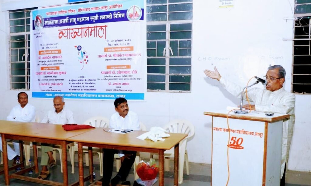 कार्यक्रमाचे अध्यक्ष प्राचार्य डॉ श्रीकांत गायकवाड यांनीही “राजर्षी शाहू महाराजांच्या सामाजिक अभिसरणातील भूमिका” या विषयाने व्याख्यानाची मांडणी केली. डॉ बाबासाहेब आंबेडकरांची भेट घेऊन त्यांचा सन्मान करणारे शाहू राजे पहिले होते.अनेक अस्पृश्य परिषदेमधून अस्पृश्य विरोधात त्यांनी विचार मांडले.दलित समाजाच्या शिक्षणासाठी खस्ता खाल्ल्या.वसतिगृह चळवळ सुरू केली. दलितांना पन्नास टक्के आरक्षण देणारे शाहू महाराज हे पहिले राजे होते. यामुळे राजर्षी शाहू महाराज हे लोकराजा होते. असे अध्यक्षीय भाषण प्राचार्य डॉ श्रीकांत गायकवाड यांनी केले.या व्याख्यानास रामराजे आत्राम,अॅड.हाशम पटेल, कवी रमेश चिल्ले, कवी रामदास कांबळे, डॉ.संभाजी पाटील, डॉ.लहू वाघमारे,प्रा.मुल्लासर, डॉ.हावळे सर,प्रा.हुडेकरी अप्पा, कवी रमेश हानमंते, कवयित्री उषा भोसले,श्री किसन भोसले, कवी दिलीप गायकवाड, डॉ.रत्नाकर बेडगे, महाविद्यालयातील विद्यार्थी प्राध्यापक उपस्थित होते.या व्याख्यानमास मसाप अध्यक्ष डॉ जयद्रथ जाधव, सचिव डॉ दुष्यंत कटारे, कवी प्रकाश घादगिने, कवी नरसिंग इंगळे,प्रा नयन राजमाने यांनी पुढाकार घेतला.सूत्रसंचालन कवयित्री प्रा.नयन राजमाने यांनी केले तर आभार डॉ जयद्रथ जाधव यांनी मानले.