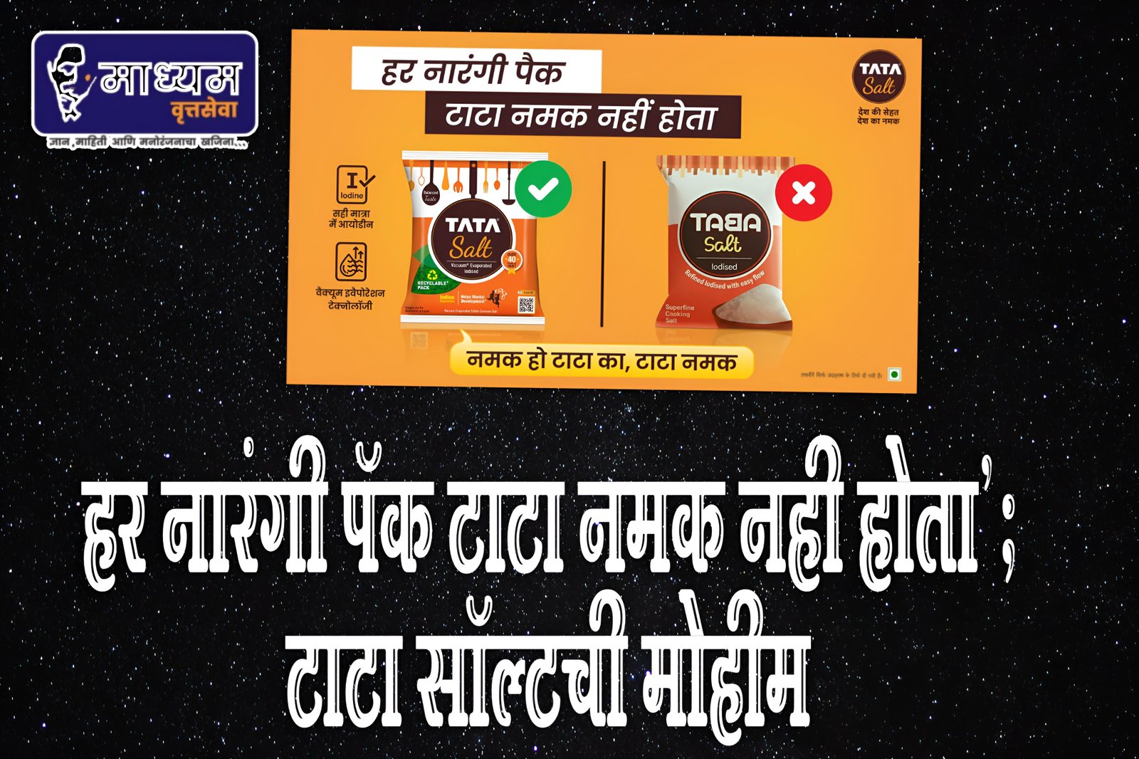 ‘हर नारंगी पॅक टाटा नमक नही होता’ या घोषणेचा उद्देश प्रत्येक केशरी रंगाचा पॅक टाटा सॉल्टचाच नसतो, याबाबत जनजागृती करण्याचा आहे. या मोहिमेद्वारे दिसायला सारख्या पण बनावट मीठ पॅकबाबत ग्राहकांचे प्रबोधन केले जाणार आहे. भेसळमुक्त, उच्च दर्जाच्या मिठाची हमी देणारा योग्य केशरी रंगाचा पॅक निवडण्याचा हा संदेश आहे. महाराष्ट्रामधील असंघटित मीठ बाजारपेठेतील आव्हानांनंतरही टाटा सॉल्ट ब्रँड हा कुटुंबांच्या आरोग्य व कल्याणासाठी विश्वासार्ह पर्याय आहे. आयोडाइज्ड, भेसळमुक्त मिठाच्या प्रत्येक पॅकद्वारे भारताच्या पोषणविषयक उद्दिष्टांमध्ये योगदान देत, त्याचे पोषणमूल्य अधोरेखित केले जाते.