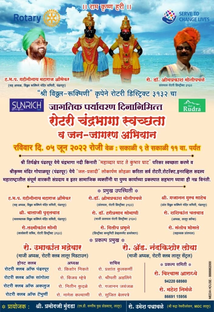 औशातील नाथ संस्थानचे पीठाधिश व पंढरपूर देवस्थान समितीचे अध्यक्ष हभप गहिनीनाथ महाराज औसेकर यांनी आपल्या आशीवर्चनात रोटश्रीच्या सेवाकार्याचे तोंड भरून कौतुक केले तसेच रोटरीचे प्रांतपाल डॉ. ओमप्रकाश मोतीपवळे यांच्या कार्याचे मुक्त कंठाने कौतुकही केले. डॉ. ओमप्रकाश मोतीपवळे यांनी येन्या ५ जून रोजी रोटरीच्या वतीने ‘चंद्रभाग स्वच्छ अभियान’ राबविण्यात येणार असल्याचे सुतोवाच आपल्या भाषणात केले होते. त्याचा धागा पकडत हभप गहिनीनाथ महाराज यांनी रोटरी क्बलच्या या स्तुत्य उपक्रमाचे स्वागत केले. पंढपपूर देवस्थान समितीच्यावतीने स्वच्छता मोहीम हाती घेतली आहेच पण, रोटरी क्लबच्यावतीने चंद्रभागाच्या कडेचा भाग स्वच्छ करण्यात येणार आहे ही बाब ऐतिहासिक आहे, देवस्थान समिती व प्रशासकीय यंत्रणेच्या माध्यमातून या अभियानास हवे ते सहकार्य करण्यात येईल.. स्वागत आहे पंढरीत रोटरी क्लबचे अशा शब्दात त्यांनी आश्वासित केले.