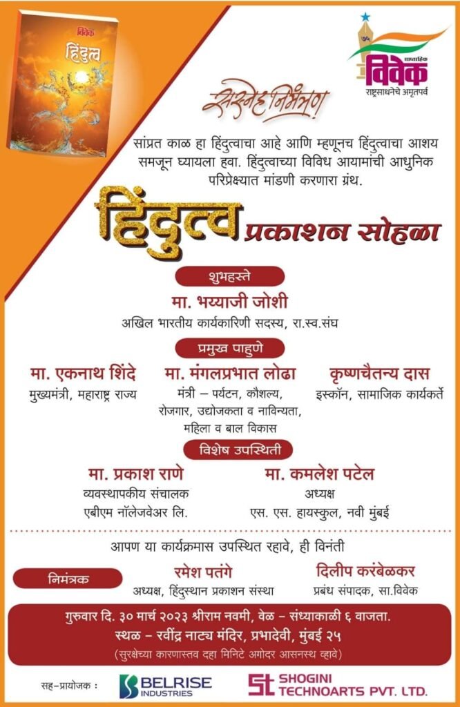 सा. विवेक प्रकाशित ‘हिंदुत्व’ या ग्रंथाचे प्रकाशन 30 मार्च रोजी सायंकाळी 6.00 वा. प्रभादेवी येथील
