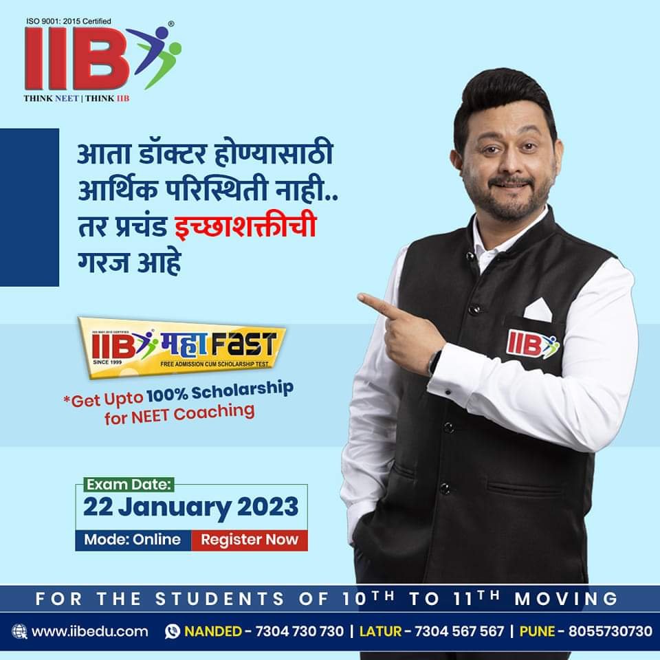 लातूर / नांदेड : डॉक्टर होण्याचे स्वप्न उराशी बाळगून जे विद्यार्थी आगामी नीट परीक्षेची तयारी करत इयत्ता ११ वीतून १२ वी मध्ये दाखल होणार आहेत त्यांच्यासाठी डॉक्टर घडविणारी गुणवत्तापूर्ण खाण म्हणून देशभर ओळख असलेल्या आयआयबी इन्स्टिट्यूटने “IIB महा FAST” ही फ्री ऍडमिशन कम स्कॉलरशिप टेस्ट घेण्यात येणार आहे. ११ वी तून १२ वी जाणाऱ्या विद्यार्थ्यांना यामुळे IIB इन्स्टिट्यूटमध्ये शिकण्याची सुवर्णसंधी प्राप्त होणार आहे. यासाठी “IIB महा FAST” ही फ्री ऍडमिशन कम स्कॉलरशिप टेस्ट ११ डिसेंबर रोजी होणार असून ही सुवर्णसंधी मिळविण्यासाठी लवकरात लवकर रजिस्ट्रेशन करावे असे आव्हान आयआयबी टीम ने केले आहे.