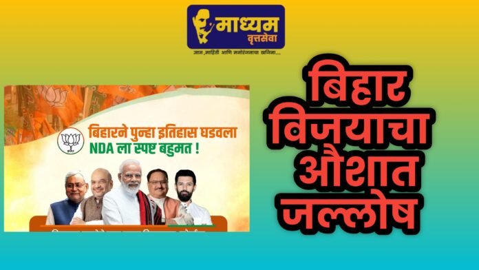 औसा : बिहार विधानसभा निवडणुकीत एनडीएला मिळालेल्या भव्य विजयाचा जल्लोष औशात मोठ्या उत्साहात साजरा करण्यात आला. शहरातील भाजप कार्यकर्त्यांनी फटाके फोडून ढोल-ताशांच्या गजरात जल्लोष व्यक्त केला. या आनंद सोहळ्यात आमदार अभिमन्यू पवार आणि अर्चनाताई पाटील चाकूरकर यांच्या हस्ते पेढे वाटून विजयाचा आनंद कार्यकर्त्यांनी आणि नागरिकांनी सामायिक केला.